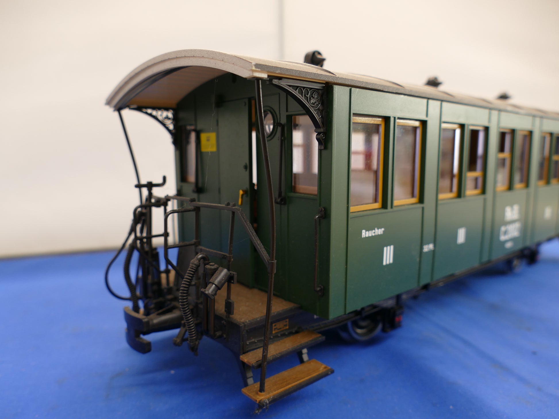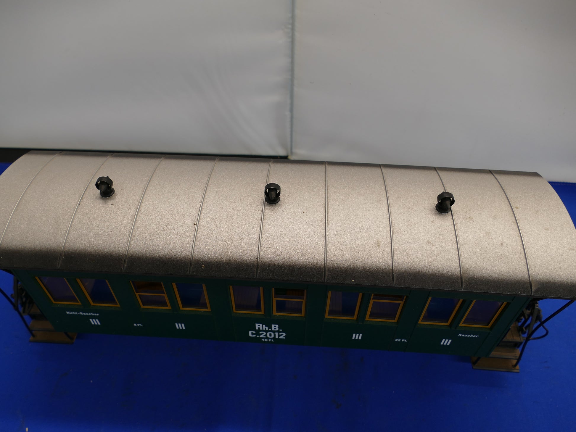 LGB model 30340 is a Rhaetian Railway passenger coach RHB C2012 in green livery.