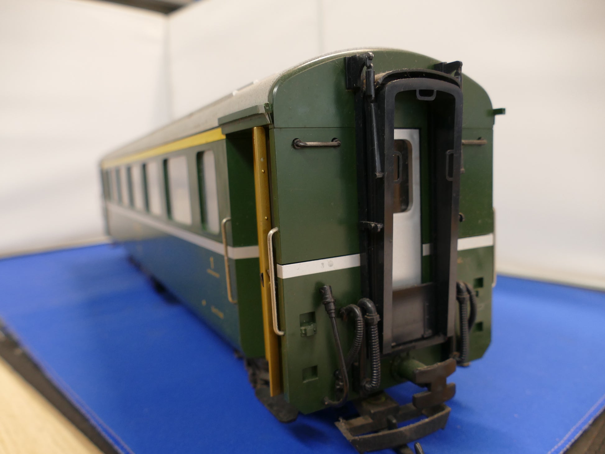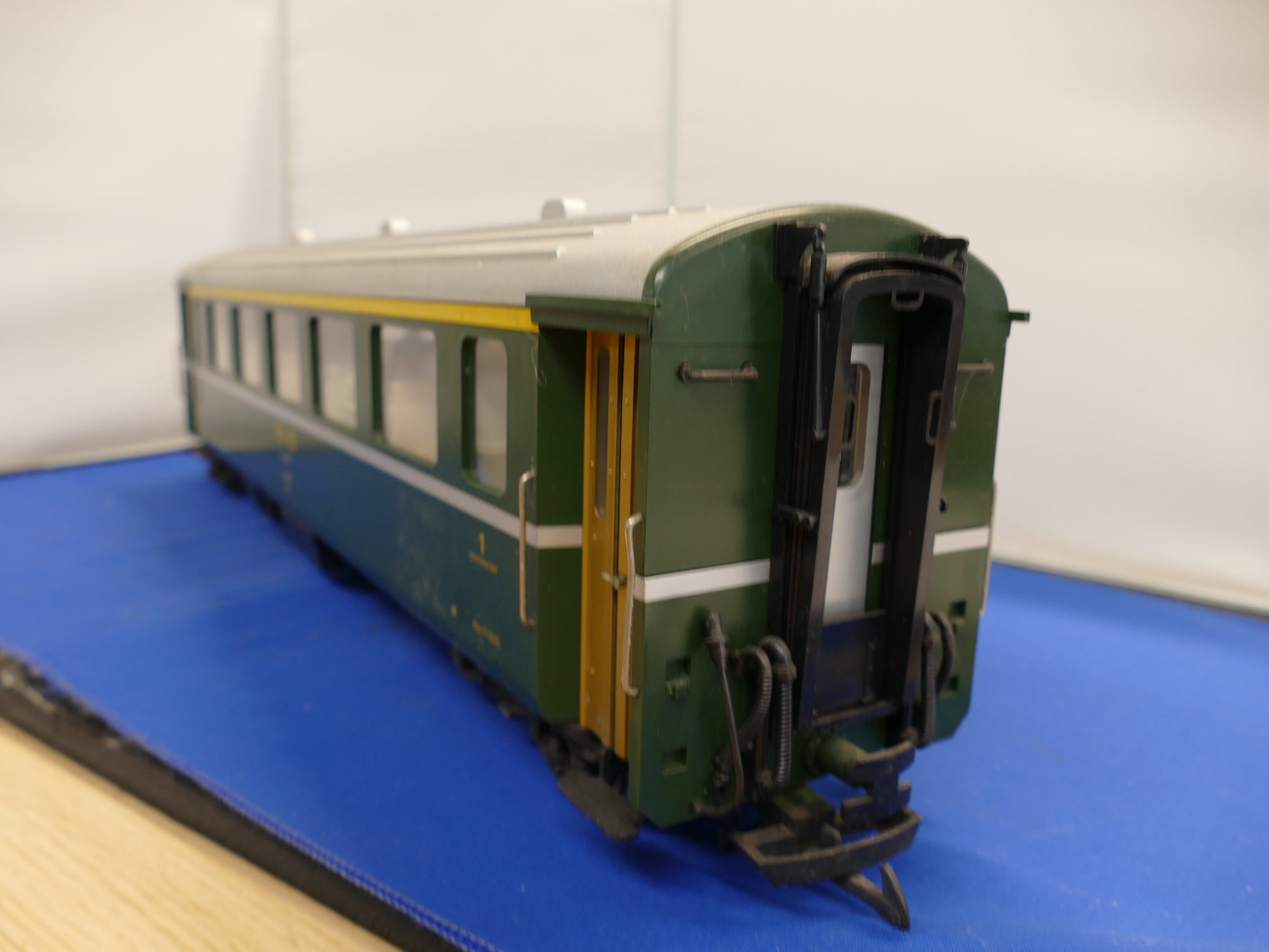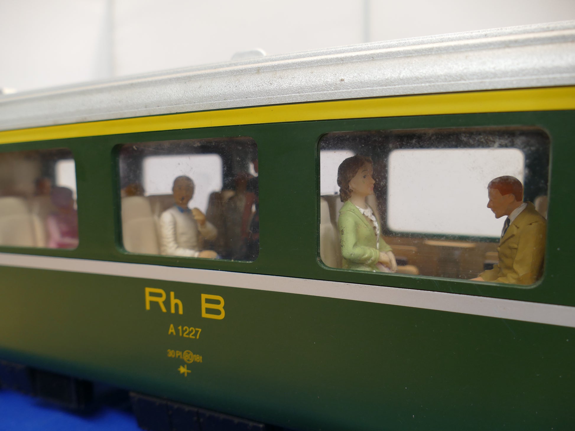 This is an RhB 1st class passenger car from the standard design RhB passenger series. This is an older model with the running # A1227. The car is equipped with metal wheel sets, and doors that can be opened. Working Lights but no box.