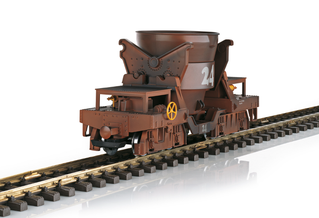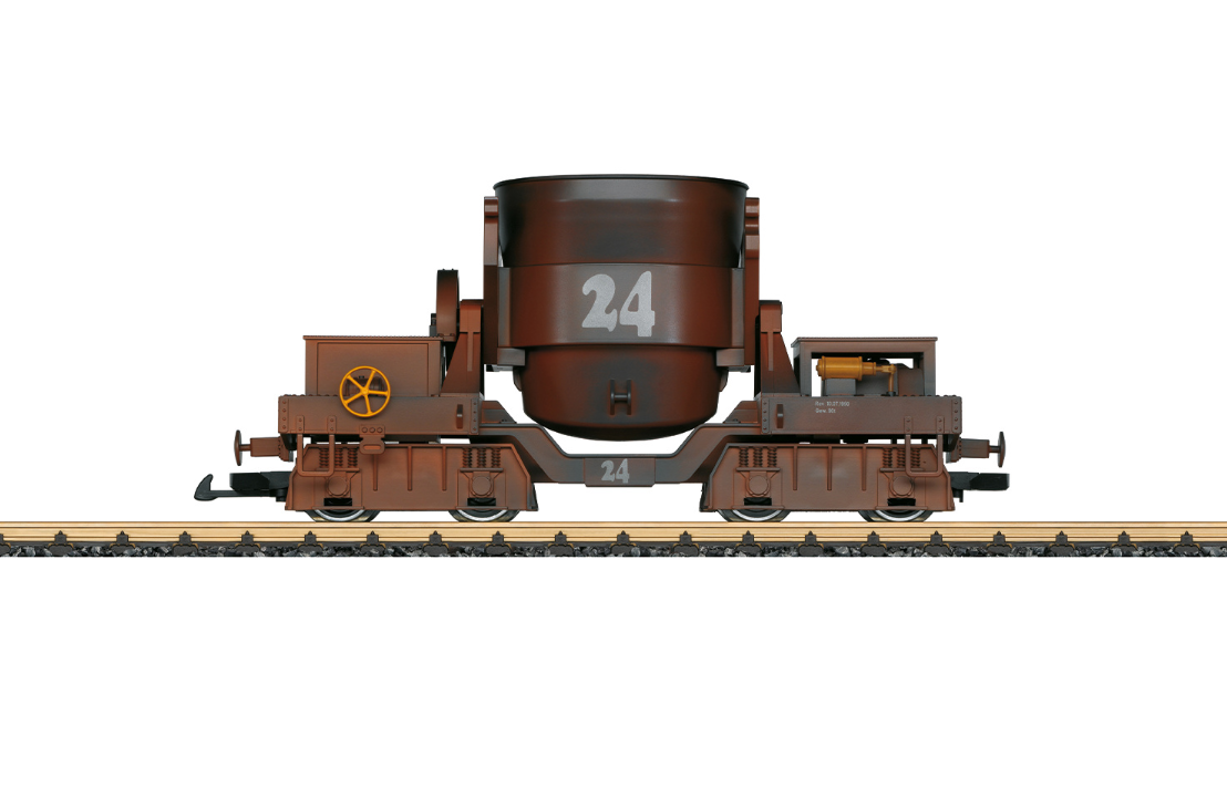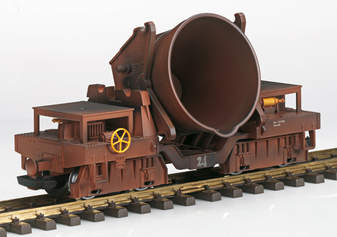This is a model of a slag car as used in many steel plants to transport slag or also molten steel. The paint scheme and lettering are correct for its use, including appropriate weathering. The hopper can be emptied digitally. Length over the buffers 32 cm / 12-5/8“.